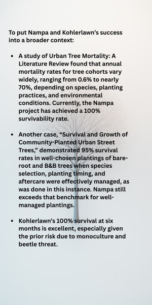 For city foresters and urban planners, this case highlights that investing in canopy diversity and healthy propagation and planting practices can yield exceptionally high survivability rates, protect public investment, and lead to healthier, longer-lasting urban forests.